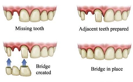 Dental Bridge uses crown on either side of tooth gap to support false teeth which makes it easier to chew and prevents teeth from being misaligned. To maintain the shape of the face, avoid teeth misalignment and to alleviate stress on other teeth, it is important to have missing teeth replaced.